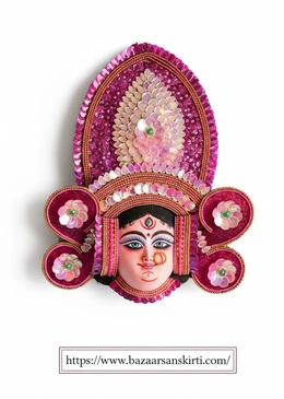 This stunning piece of art is handcrafted by the traditional artisans of Charida, Purulia. Representing Maa Durga in her benevolent yet powerful form, this mask features a unique elongated crown and intricate sequin work that sets it apart from traditional designs. It is a perfect fusion of ancient heritage and vibrant aesthetic appeal.
