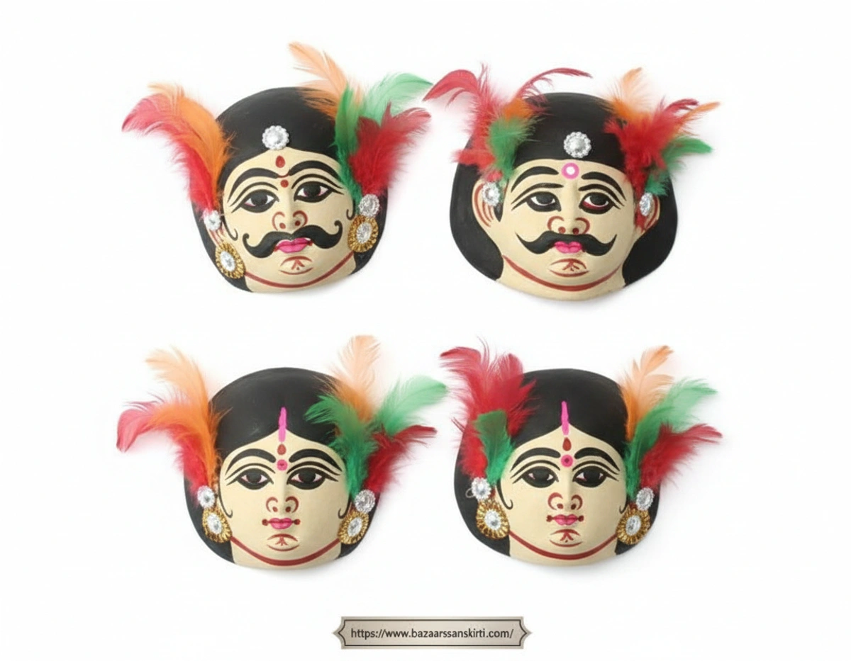 This set features a beautifully detailed "Husband and Wife" duo, representing the indigenous tribal communities of West Bengal. Traditionally used in the world-famous Chhau Dance (a UNESCO-recognized intangible cultural heritage), these masks are more than just decor—they are a piece of living history.