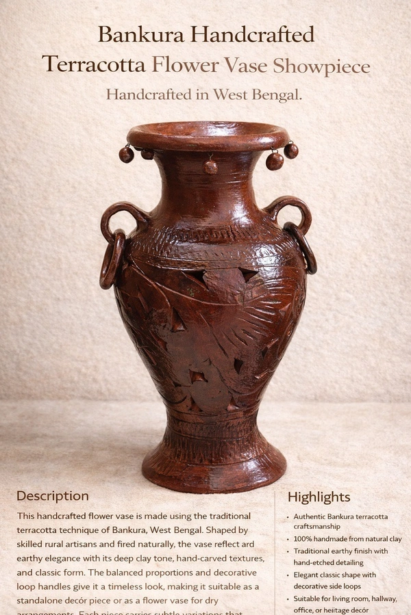 This handcrafted flower vase is made using the traditional terracotta technique of Bankura, West Bengal. Shaped by skilled rural artisans and fired naturally, the vase reflects earthy elegance with its deep clay tone, hand-carved textures, and classic form. The balanced proportions and decorative loop handles give it a timeless look, making it suitable as a standalone décor piece or as a flower vase for dry arrangements. Each piece carries subtle variations that highlight its handmade character.