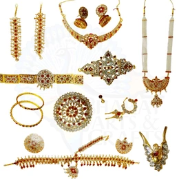 - Complete Set of 10–12 Pieces: Includes essential pieces such as maang tikka, choker, long haram, earrings, vanki, belt, bangles, nose ring, rakodi, and more to ensure you are stage-ready.